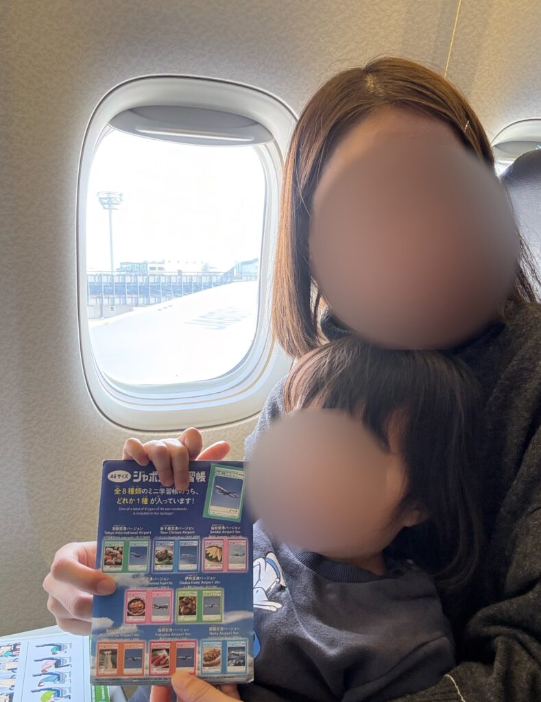 帰りの便はアニメが見れず、シールブックをひたすらやっていました。
